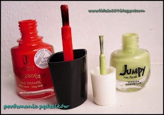 Joko Find Your Color - J42 - Coriander green - nazwa nie wiem czy trafna, ale sądząc po obrazkach z google można uznać za trafną ;). Jak dla mnie jest to głęboka, morska zieleń - zresztą bardzo ładna. Kryje już przy 1 warstwie jednak ja dla reguły dałam 2. Nazwa lakieru jak u poprzednika również mi się starła. Czas schnięcia lakieru jest dść szybki, powiedziałabym, że wysycha szybciej niż normalne lakiery. Trwałości jeszcze nie sprawdzałam, ale na pewno jest lepsza od poprzednika - drugi dzień i brak odprysków. Pędzelek taki sam jak u poprzedniego lakieru - załączam porównanie z Jumpkiem. Konsystencja lakieru jest świetna i przyjemnie się nią operuje.